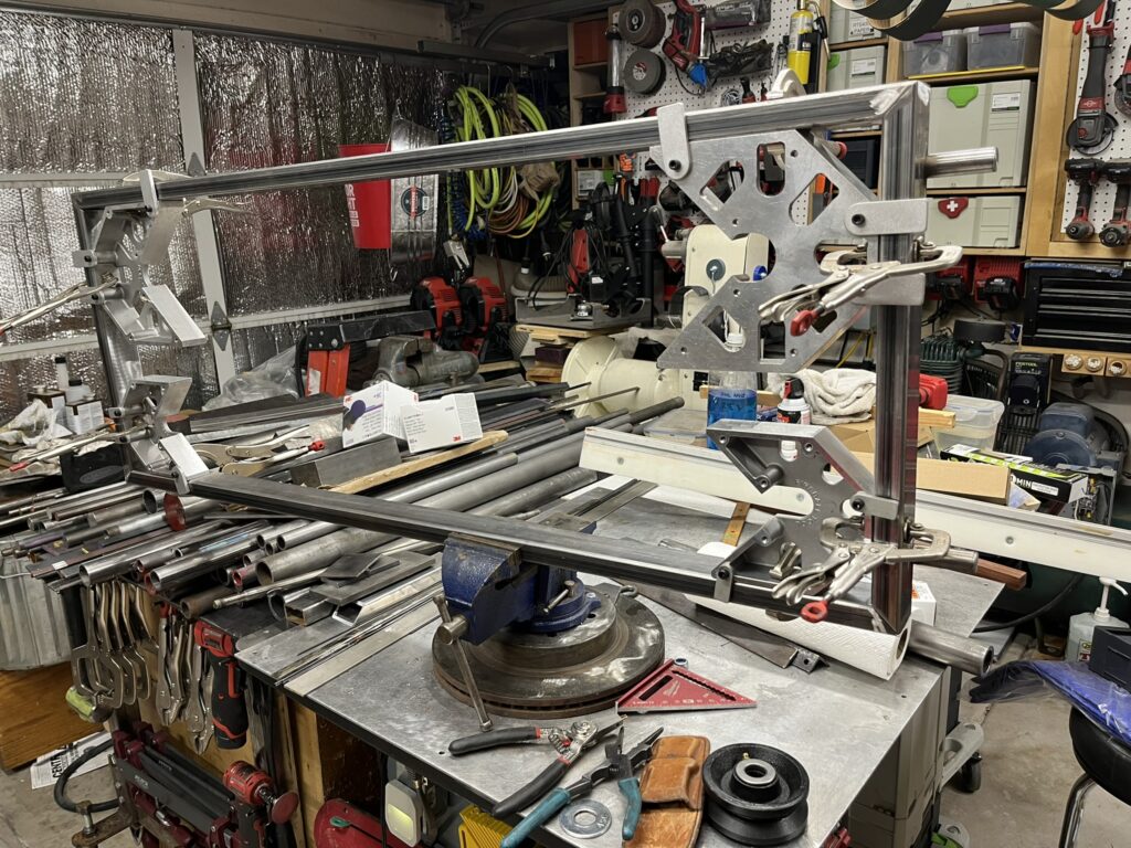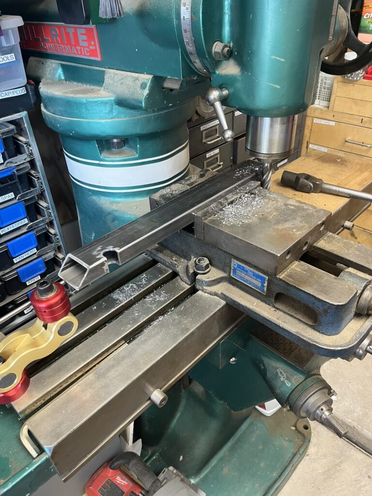 I looked around the shop, and decided I could relocate the parts containers that were on the floor under my shelving unit. This would give me a volume about 60″ long, 18″ wide, and 8″ deep. After trying out a few ideas in Fusion 360, I came up with a design using the V type wheels often used for gates. I had a stick of .120 wall 1×2 tubing that I used for the frame, so it got cut into some mitered pieces for the sides and ends. I didn’t need or want much floor clearance, so I used the mill to cut some 3/4″ wide notches into the end pieces to give me a solid place for welding the axles. I needed to have room for wheels, so the final dimensions for the bed were 48″ x 18″ (exterior dimensions)