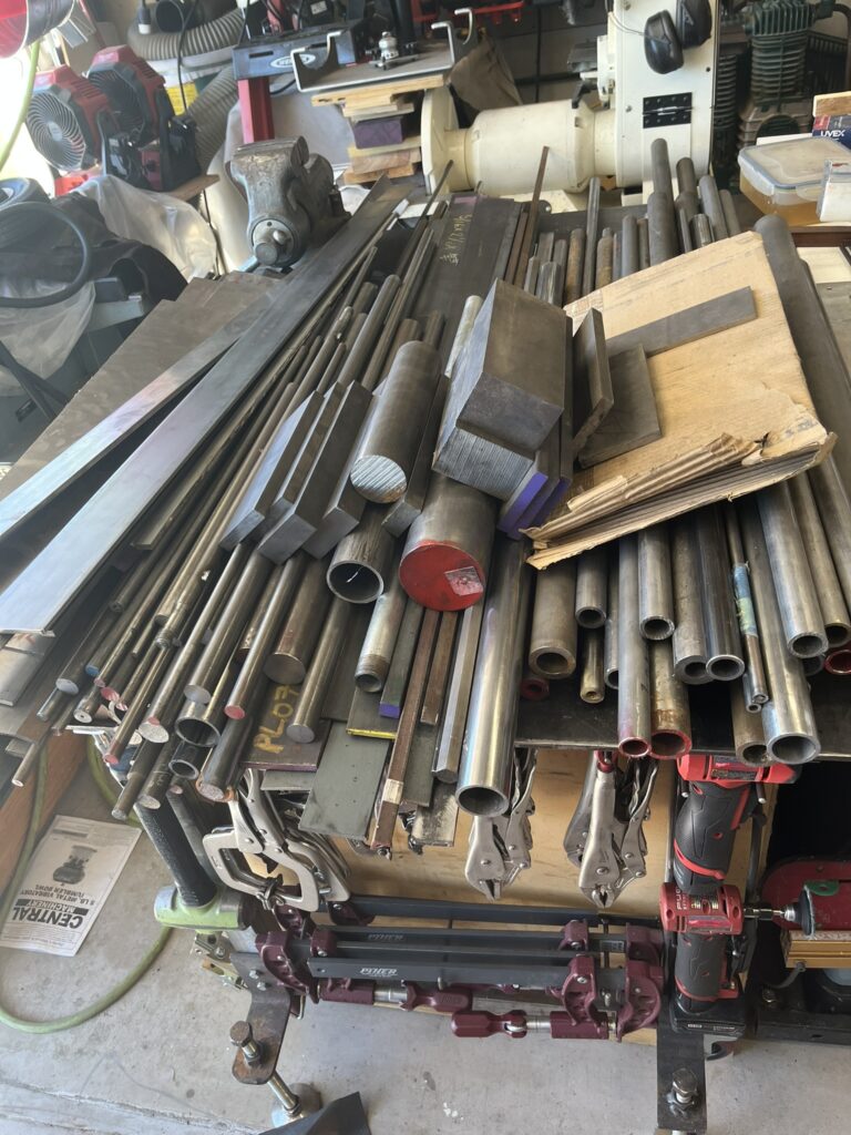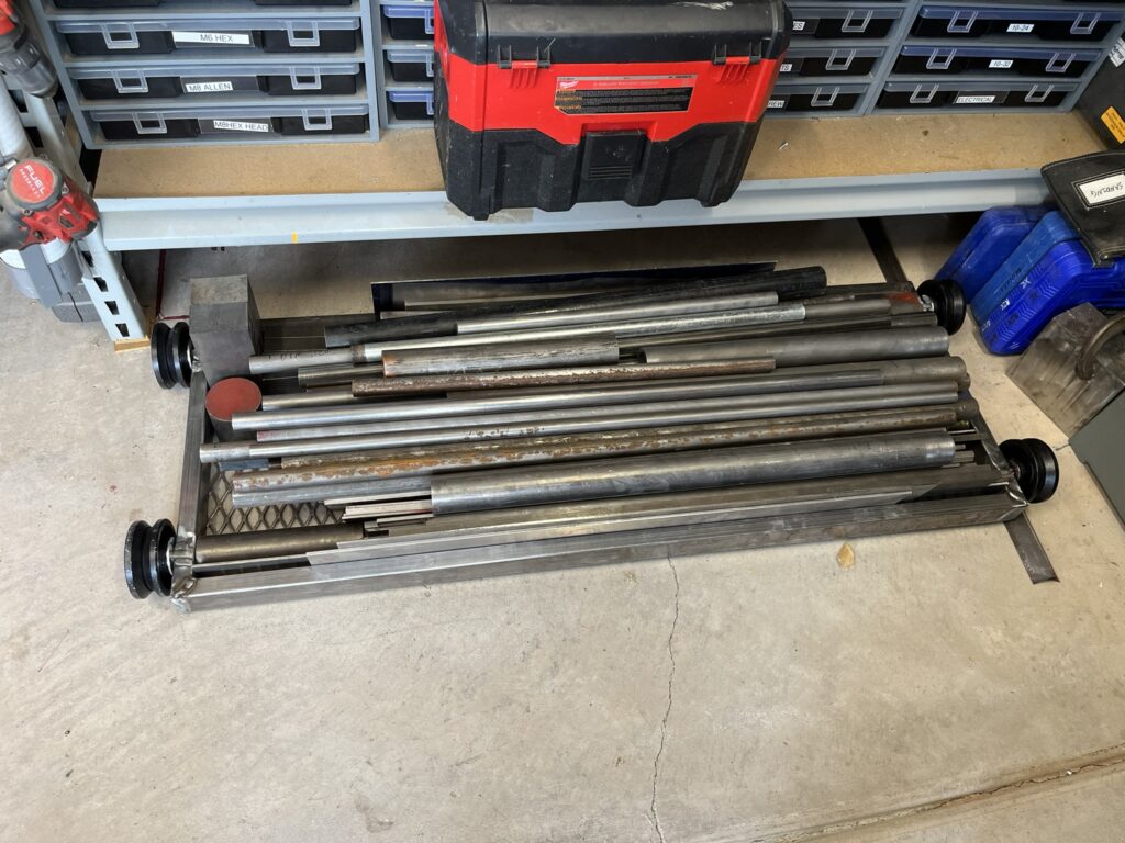 There was more there than I expected, and of course the cart is much easier to get moving. When I buy cold rolled steel, or a specialty steel like 12L14, I have to buy a 12′ stick. I usually leave a 7′ piece standing against the wall, then the remaining pieces go into the cart. My local metal supplier also has a good remnants section where I can pick up 18″ – 36″ pieces of DOM (drawn over mandrel) tubing, so I tend to grab some when I see a size I don’t already have, or a size I use often. I didn’t really have a good place to store these shorter pieces.