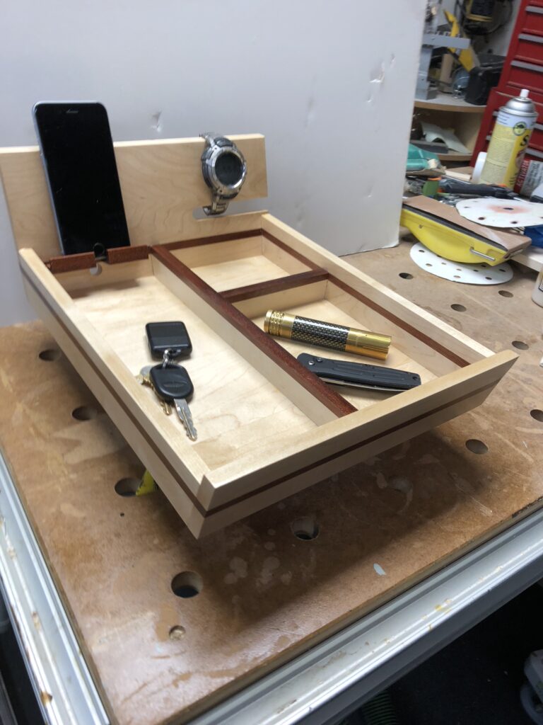 When my nephew graduated high school, I had a hard time coming up with a gift idea. I settled on this dresser valet organizer. I made it from maple with bloodwood trim. His high school colors were red and white, so I thought it would be fitting.