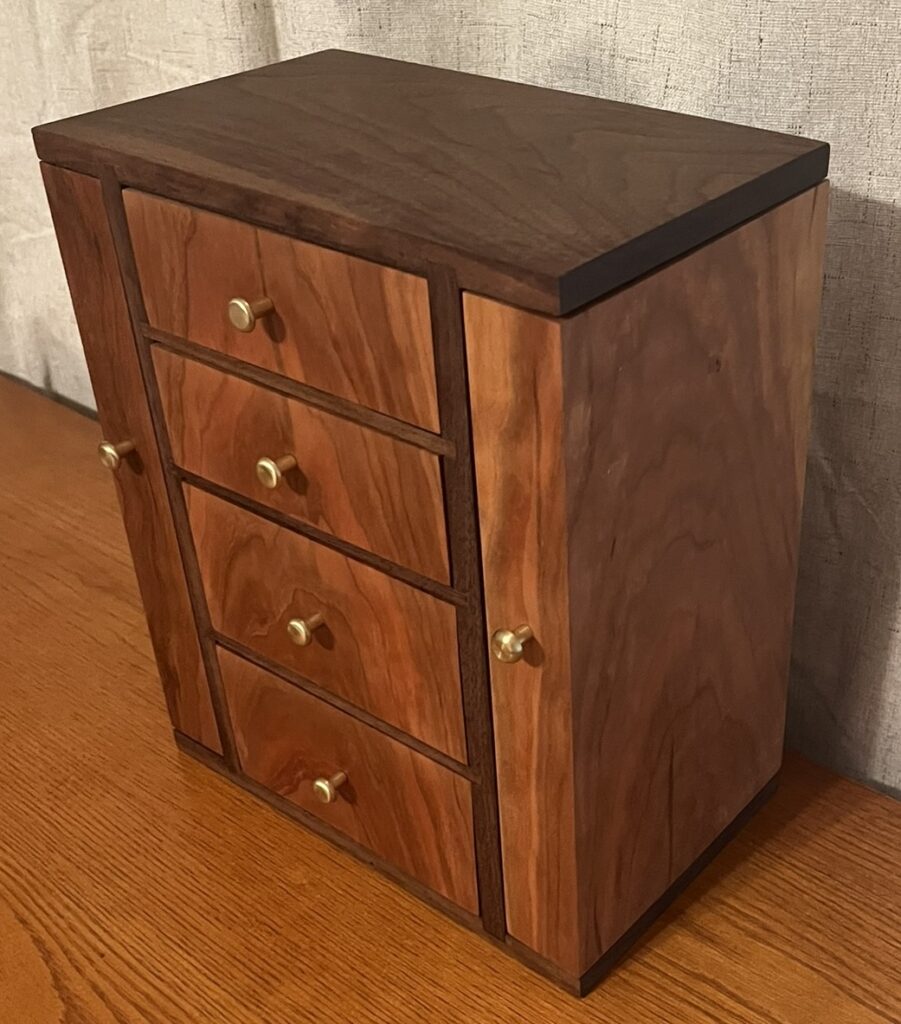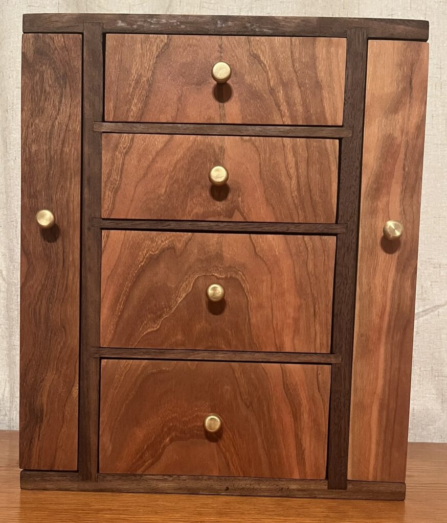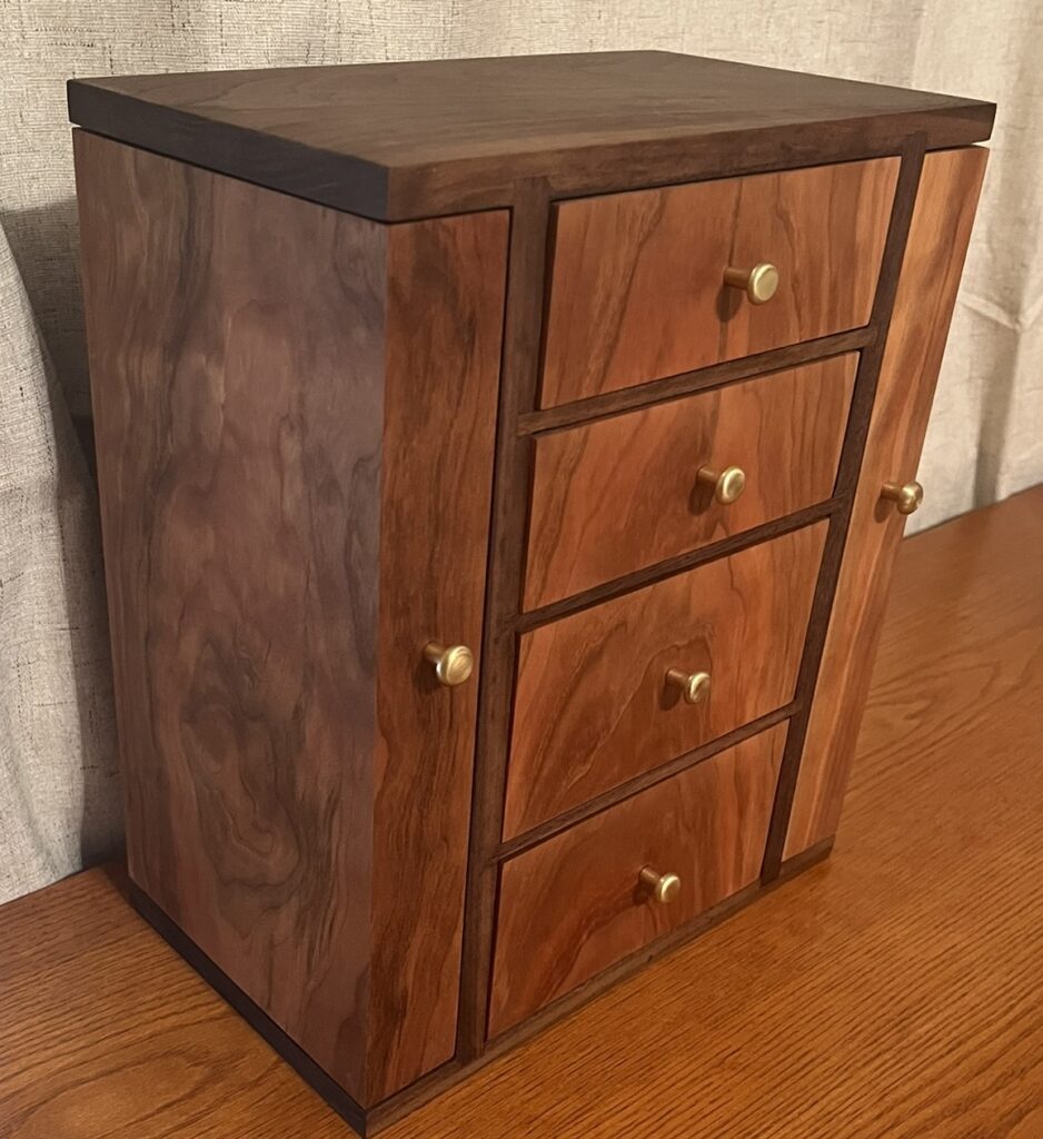 Overall this was challenging because I was out of practice with fine, precise woodworking, and I had a few mistakes where I had to remake pieces from scratch. As I neared completion, that worried me more and more. If I screwed up on a drawer, I’d have to remake them all as the grain flow was important to the overall appearance. I am mostly pleased with how it came out and am ready for my next project.