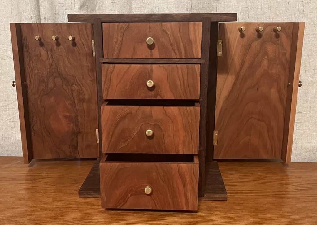 The sides open to reveal some posts for hanging necklaces. The hinges are solid brass Brusso Stop Hinges. The necklace hangers are also made by Brusso. The 2 bottom drawers are 3″ deep and the two top are 2″ deep. At this point, I haven’t lined the drawers, but I have some ring holders I can install if that’s what my wife wants.