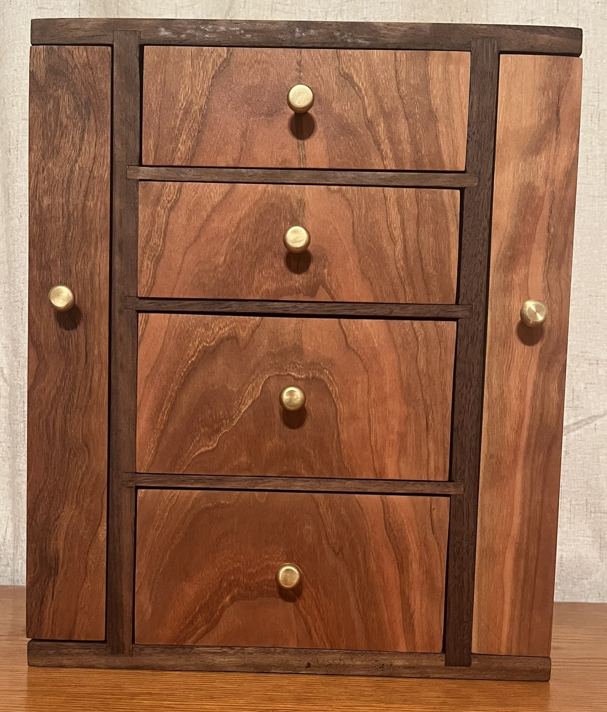 The drawers and sides are solid cherry. The frame is 1/2″ walnut with 1/4″ dividers. I used 1/4″ thick pieces for the drawer sides and bottoms, and 3/8″ thick pieces for the side doors. The drawer fronts are a single piece of cherry cut so the grain flows across them. I intentionally avoided using any “standard” 3/4″ lumber. On a box this small, that size lumber is way too beefy so I stuck with more proportionally appropriate thicknesses. I couldn’t find any pulls I liked, so I turned these from a piece of 1/2″ solid brass.